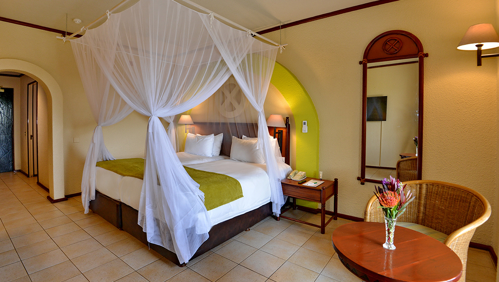 The rooms and suites are luxuriously decorated, providing a combination of African ambiance and elegance. Each en-suite bedroom has air conditioning, digital satellite television, hairdryer, safe, and a balcony with sweeping views over the golf course and surrounding bush. Game can often be spotted wandering across the golf course. There is complimentary Wi-Fi available for all guests.