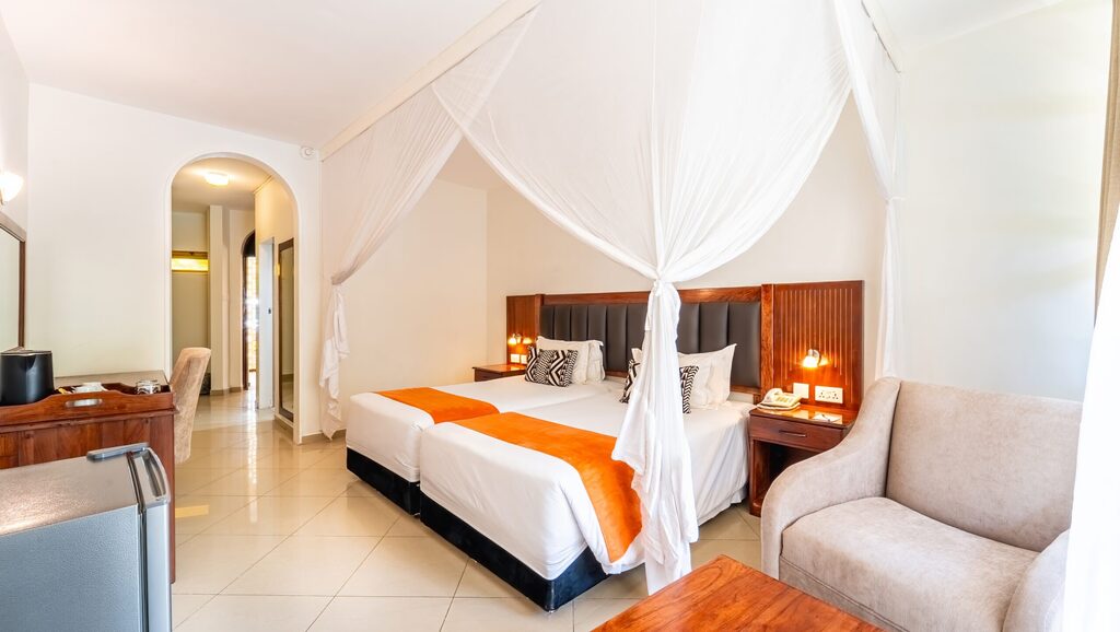 The Victoria Falls Rainbow Hotel will accommodate you in one of the 88 rooms available. 54 of these rooms are Standard Twins, 30 x Standard Doubles, 2 x Family Suites, 2 x Suites and 2 x Deluxe Suites. The hotel is child-friendly and offers 13 sets of family inter-leading rooms. The rooms feature either a queen, standard double beds or ¾ twin beds, private bathrooms, air cons, TV’s, Wi-Fi, landline telephones, mini bar, mosquito nets, hair dryer and safety deposit boxes.